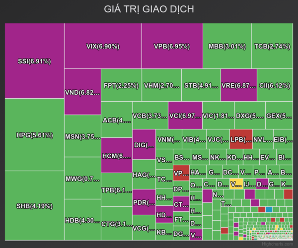 SBS, MBS, HAC, AAS, PSI, WSS, BVS, FTS, VIG, EVS, ABW, BSI, TVS 등 다른 종목들도 5% 이상 상승했다. 이 종목들의 유동성은 SSI가 약 5,350만 주, VIX가 4,470만 주, VND가 3,460만 주를 돌파하는 등 폭발적으로 증가했다.