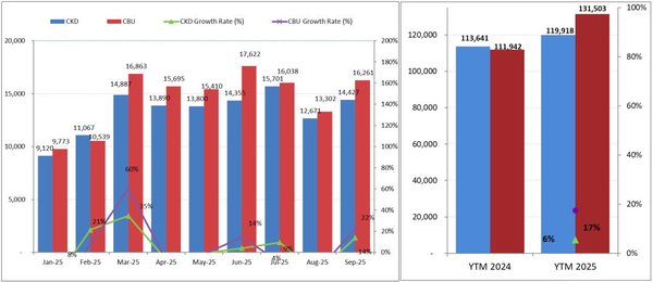 차량 원산지별로 보면, 9월 국내 조립 차량 판매량은 1만 4,427대로 전월 대비 14% 증가했다. 반면 완전 수입 차량은 1만 6,261대로 22%나 급증하며, 베트남 내 조립 차량을 앞질렀다. 이는 수입차가 7개월 연속 국내 생산 차량 판매량을 앞서는 기록이다.