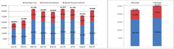 VAMA 회원사들의 9월 총 차량 판매량은 3만 688대에 달했다. 이 중 승용차는 2만 559대, 상용차는 9,535대, 특장차는 594대로 집계됐다. 전월 대비 승용차 판매는 19%, 상용차는 14%, 특장차는 무려 97% 급증했다. 다만 전년 동월 대비 전체 판매량은 여전히 16% 감소한 수준이다.
