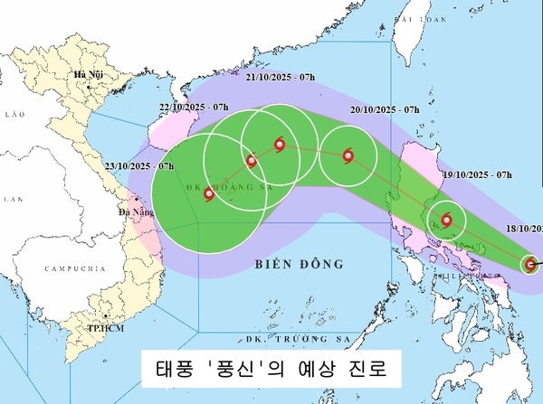 풍신은 내일 아침(10월 19일)경 필리핀 루손 섬에 상륙할 것으로 예상된다. 내일 오후와 저녁에 풍신은 루손 섬을 통과하여 동해로 진출하며 올해 12번째 태풍이 될 것이다. 국립 수문기상예보센터는 태풍이 동해로 진입한 후 주로 서북서 방향으로 이동하며 계속 강화되어 호앙사 특별 지대를 향해 나아갈 것이라고 밝혔다.