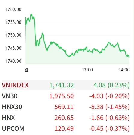 빈그룹 주가가 상한선을 돌파한 덕분에 오늘 VN-지수는 4포인트 이상 상승하여 1,741.3포인트를 기록했다.