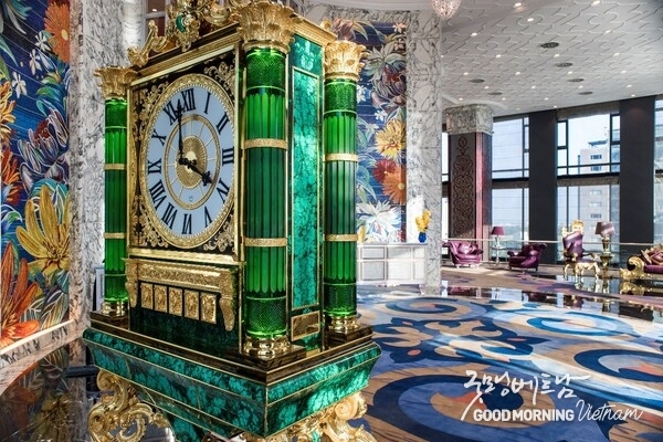7층 로비에 들어서면 에메랄드빛 공작석으로 제작된 3미터 높이의 발디(Baldi) 기념 시계와 5미터짜리 24K로 도금한 콜롬보스틸(Colombostile) 소파가 호화롭고 웅장한 분위기를 연출한다.