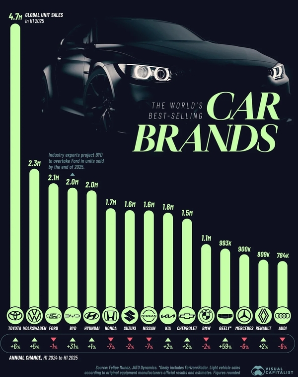 도요타는 2025년 상반기에 470만 대를 판매하며 세계 최대 자동차 판매 브랜드 자리를 굳건히 지켰다. BYD는 주요 자동차 제조업체 중 가장 빠른 성장을 보였으며, 업계 전문가들은 2025년 말까지 포드를 추월할 것으로 예상한다.