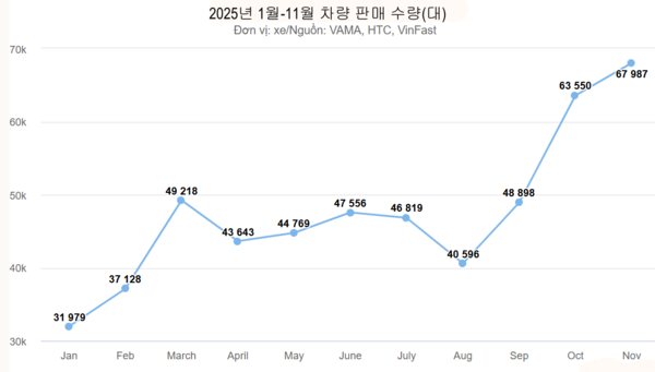 위 수치에는 베트남자동차제조협회(VAMA) 39,338대, 빈패스트 23,186대, 현대자동차 5,463대의 판매량을 포함한다. 11월 판매량은 올해 들어 최고치를 기록했으며 전월 대비 약 7% 증가했다.