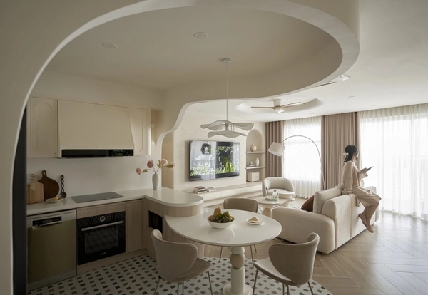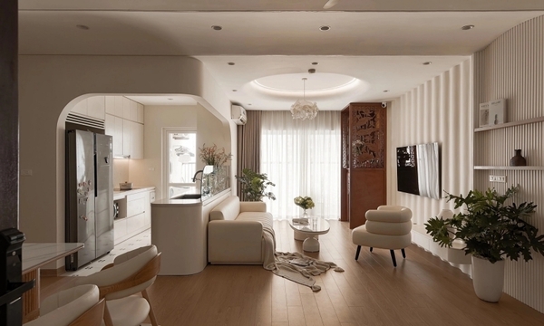 하노이에 위치한 이 135m² 규모의 아파트는 1618 디자인 스튜디오에서 설계 및 시공했으며, 곡선 디테일을 많이 활용하여 깊이감과 부드러움을 표현했다. 베이지, 화이트, 우드 브라운 색상의 조화와 헤링본 바닥은 시각적 균형을 잡아준다.