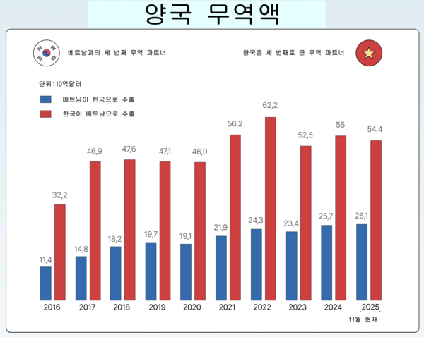 두 나라는 또한 특별한 유대 관계를 공유하고 있는데, 바로 베트남과 한국의 시댁/처가 가족입니다. 약 10만 명의 베트남 여성이 한국 남성과 결혼했고, 베트남 내에도 2만 쌍에 달하는 베트남-한국 혼인 부부가 살고 있습니다. 따라서 베트남과 한국의 관계는 마치 '가족' 관계와 같다고 할 수 있습니다.
