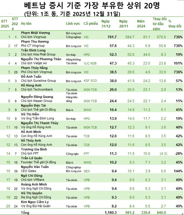 2025년 마지막 거래일 종가 기준, 베트남 증시 상위 20대 부호의 총 자산이 1180조 동을 돌파하며 전년 대비 대폭 증가했다. 이 중 팜낫브엉 빈그룹 회장이 압도적 1위를 차지하며, 그의 자산만으로 후순위 140명에 맞먹는 규모를 기록했다.