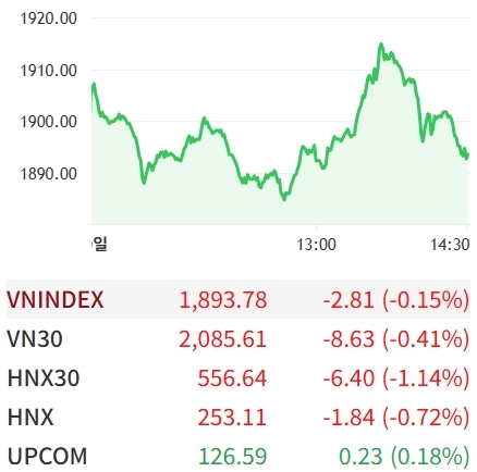 하지만 이러한 상승세는 오래가지 못했다. VN30 바스켓의 매도세로 인해 VN지수는 상승세에서 하락세로 전환하며 기준점 대비 3포인트 가까이 하락한 1,894포인트 아래로 마감했다. 이로써 지난주 말부터 이어져 온 상승세가 막을 내렸다.