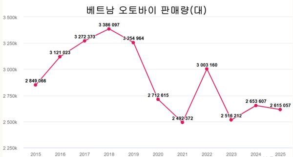 베트남 오토바이 제조업체 협회(VAMM)의 자료에 따르면, 2025년 4분기에는 709,034대의 오토바이가 판매되어 2024년 대비 6.8% 감소했다. 혼다, 야마하, 피아지오, 스즈키, SYM 등 VAMM 회원사 5개 브랜드의 2025년 총 판매량은 2,615,057대로, 2024년 대비 1.5% 감소했다. 이는 전년 대비 1.5% 감소한 수치로, 팬데믹 직후였던 2021년 수준을 제외하면 지난 10년 사이 최저치에 해당한다. 업계에서는 이를 단순한 경기 부침이 아닌, 휘발유 오토바이 수요가 사실상 '정점'을 지나 붕괴 단계에 진입한 신호로 받아들이고 있다