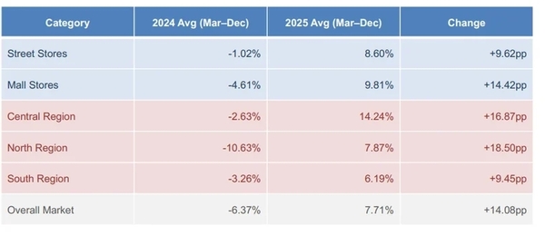 패션, 의류, 전자제품, 화장품 등 2,000개 이상의 비필수 소매점을 대상으로 한 이번 분석에서는 전체 시장이 2024년 6.37% 감소에서 2025년 평균 7.71% 성장으로 급격히 반등할 것으로 전망했다.