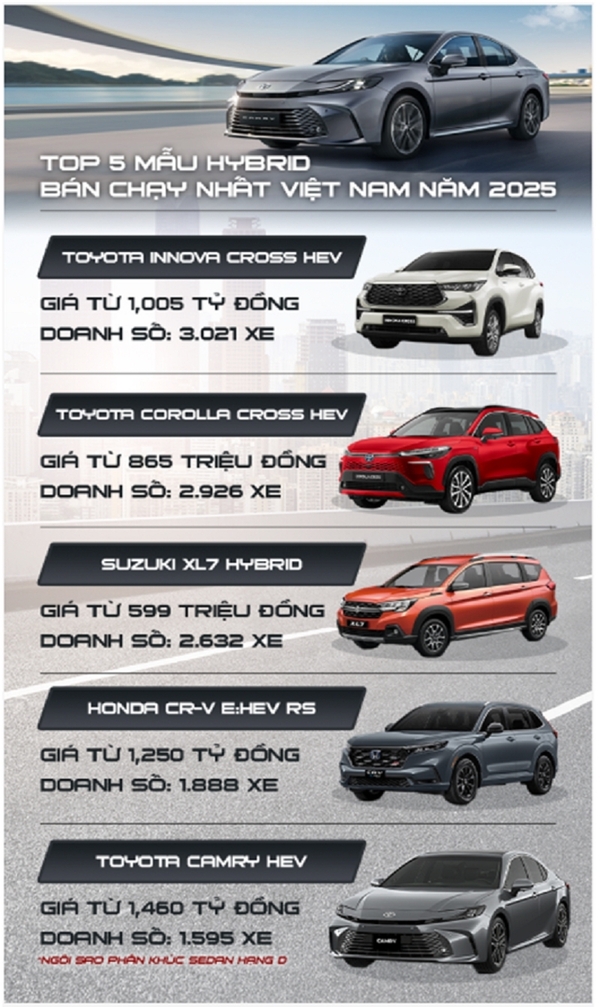 2025년 베트남의 하이브리드 자동차(HEV) 시장은 성장세를 보이며 전체 판매량이 1만 5천 대를 넘어섰다. 이는 특히 전기차 충전 인프라에 대한 소비자들의 우려가 커지는 상황에서 하이브리드 자동차가 실용적인 "과도기적" 선택지로 자리매김하고 있음을 보여준다. 지난 가장 많이 팔린 HEV 모델 5종에 대한 데이터 또한 이러한 추세를 명확히 보여준다. SUV/패밀리카가 시장을 주도하고 있지만, D세그먼트 세단 역시 특유의 고객층 덕분에 여전히 강세를 유지하고 있다.
