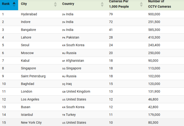 1위는 인도 하이데라바드로 인구 1,000명당 79대의 카메라가 설치되어 있으며, 그 뒤를 인도르(72대)와 벵갈루루(41대)가 잇습니다. 이 세 도시에 설치된 카메라를 모두 합치면 170만 대가 넘는다.