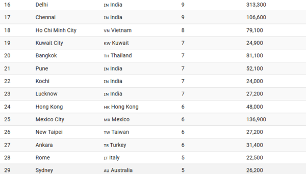 [굿모닝베트님] 인도 도시들이 순위 상위권을 차지하고 있으며, 하이데라바드(인구 1,000명당 79대의 카메라)가 전 세계에서 가장 높은 감시 수준을 보이고 있다. 상위 10개 도시 중 8개가 아시아에 있다. 나머지 두 도시는 러시아에 있다.