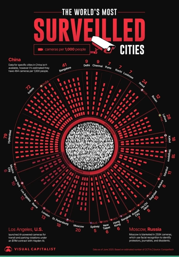 중국은 7억 대의 카메라(인구 1,000명당 494대)를 보유하고 있지만, 도시별 데이터는 제공되지 않는다. 감시는 현대 도시의 특징이 되고 있지만, 감시 수준은 도시마다 크게 다르다.