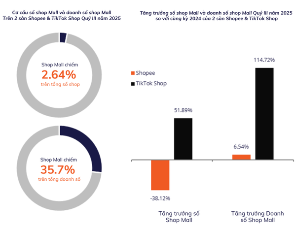 두 개의 이커머스 플랫폼인 쇼피(Shopee)와 틱톡(TikTok)에서 또 다른 주목할 점은, 샵몰(Shop Mall) 그룹(정품 매장)이 전체 매장 수의 2.64%에 불과하지만 2025년 3분기 매출의 최대 35.7%를 차지한다는 것이다.