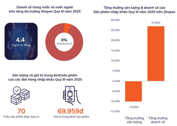 Shopee에서 수입품은 생산량 감소에도 불구하고 매출이 크게 증가했다. 특히 2025년 3분기에 이 제품군의 매출은 4조 4천억 동에 달해 같은 기간 대비 27% 증가한 반면, 생산량은 10% 감소했다. 이로 인해 평균 가격은 제품당 약 7만 동까지 상승했는데, 이는 고품질 제품을 선호하는 소비자 트렌드와 해외 판매자의 상품에 대한 신뢰도가 높아졌음을 보여준다.