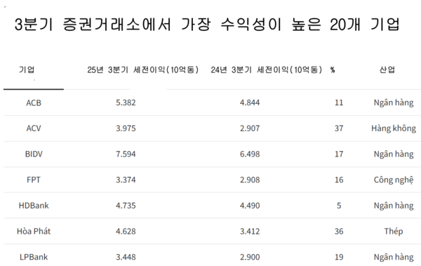 이번 3분기 실적 상위 20개 기업 명단에는 Hoa Phat(철강), Vingroup(지주), ACV(공항운영), FPT(IT), PV Gas(가스), Vinamilk(유제품) 등이 포함됐으나, 이익 규모에서는 금융권의 압도적 우위가 이어지고 있다.