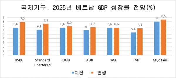 2025년 3분기 GDP 성장률이 예상치를 뛰어넘어 8.23%에 도달하자, 일련의 국제 기관이 동시에 2025년 베트남의 성장률에 대한 전망치를 높였다. 그 중 HSBC가 7.9%로 가장 높게 예측했고, 그 다음으로 Standard Chartered가 7.5%, UOB가 6.9%, ADB가 6.7%, WB가 6.6%, IMF가 6.4%를 예측했다. 이는 베트남이 여전히 동남아 지역에서 가장 높은 성장률을 보이는 국가이다.