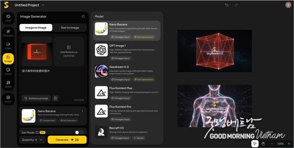 이번에 업그레이드된 스카이릴스에서는 모든 AI 기능과 세계 최고의 AI 모델이 단일 창작 작업 공간에 완벽하게 통합되었다. 하나의 캔버스가 통합형 AI 도구 역할을 하여 이미지, 동영상, 음악, 기타 멀티모달 콘텐츠를 손쉽게 병합할 수 있다.