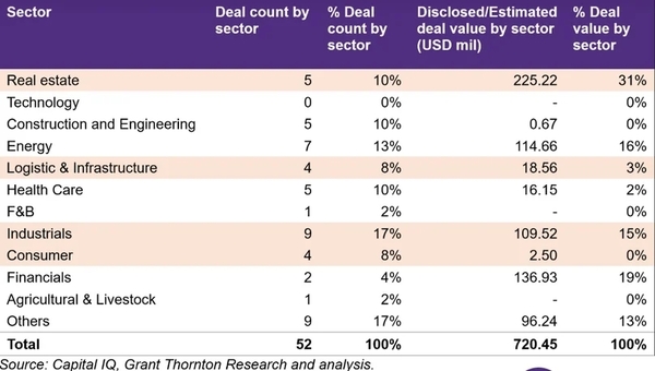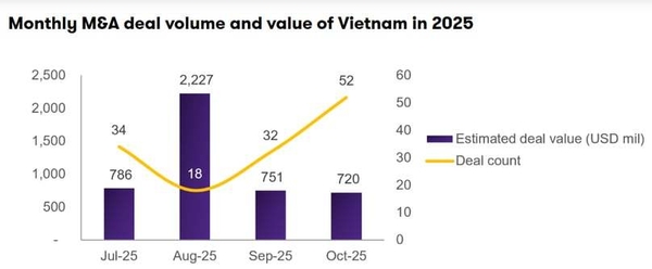 베트남 M&A 시장이 10월 회복세를 보이며 부동산·산업 부문이 거래액을 주도했다. 그랜트소튼(Grant Thornton: https://www.grantthornton.com.vn/) 분석에 따르면, 52건 거래가 성사되며 공개·추정 가치 총 7억2,045만 달러(약 10조 원)를 기록했다. 에너지·금융 부문도 강세를 보였으나, 산업 다각화가 뚜렷해지며 시장 활성화 조짐을 보이고 있다.
