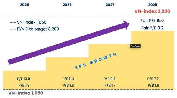 PYN 엘리트는 VN지수가 지난 15년간 P/B 3.0배를 세 차례 돌파했으며, 장기 평균 P/E는 16배, 세 기간 동안 20배를 넘었다고 분석했다.