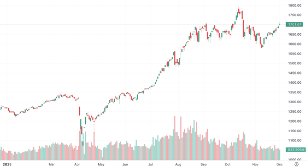 12월 첫 거래일인 1일 VN지수가 1700선을 회복하며 1701.67(+10.68p, +0.63%)로 마감했다. 장중 한때 1713.77까지 치솟았으나 매도세가 거세지며 상승폭은 줄었다.