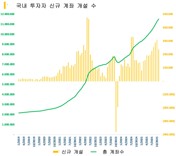 올해 11월까지 국내 투자자의 증권 계좌 수는 약 230만 개 증가했다. 2025년 11월 말 기준 개인 투자자는 총 1,150만 개 이상의 계좌를 보유하고 있으며, 이는 전체 인구의 약 11%에 해당한다. 이로써 2030년까지 목표를 조기에 달성할 수 있게 되었다.
