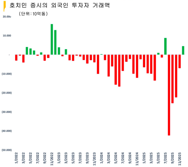 긍정적인 점은 외국인 투자자의 압력이 크게 감소했다는 것이다. 11월 외국인 투자자들은 호세에서 6조 9천억 동 이상을 순매도했는데, 이는 4개월 만에 최저 수준이다. 8월, 9월, 10월의 이전 3개월 동안 순매도 총액은 약 90조 동에 달했다. 12월 초 이후 약 4조 4천억 동을 순매수했던 외국인 자금이 반전 조짐을 보이고 있음을 알 수 있다.
