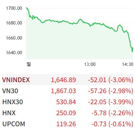 이날 VN지수는 장 초반 소폭 상승 출발했으나 곧바로 매도 공세에 밀려 기준선을 밑돌았다. 오전 중 1680선 근처에서 등락을 거듭하던 지수는 오후 들어 매도 물량이 쏟아지면서 급전직하했다. 오후 2시 20분께는 수십 개 대형주가 동반 하한가를 기록하며 지수가 한때 60포인트 이상 빠지기도 했다.