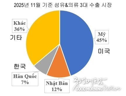 시장별로 보면 미국은 베트남 섬유·의류 최대 수출국이다. 1~11월 대미 수출액은 160억달러 이상으로, 전년 동기 대비 10% 증가했다. 일본은 41억달러로 2위를 차지했으며, 전년 대비 6% 증가했다. 반면 한국은 26억달러로 3위였지만, 전년 동기 대비 9% 감소했다.