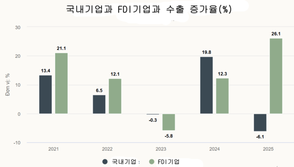 지난해 약 5천억 달러에 달하는 수출은 주로 외국인 직접투자(FDI)에 힘입은 것이지만, 국내 기업들은 어려움을 겪었고, 이러한 어려움은 2026년까지 이어질 가능성이 있다.