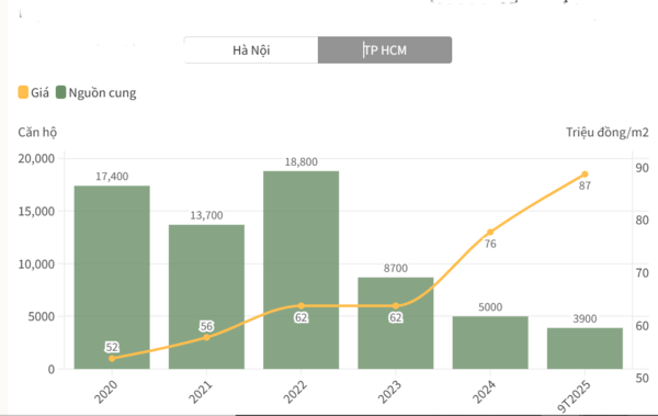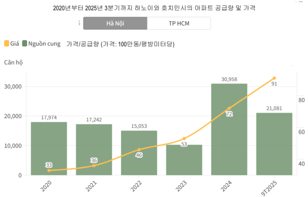 실제로 하노이와 호치민시 등 주요 도시의 아파트 가격은 최근 지속적으로 상승세를 보이고 있다. 부동산 컨설팅 회사 CBRE의 자료에 따르면, 하노이에서는 2025년 3분기 말까지 신규 분양 아파트 평균 가격이 평방미터당 9,100만 동을 예상한다. 호치민시의 경우 평방미터당 8,700만 동이다.