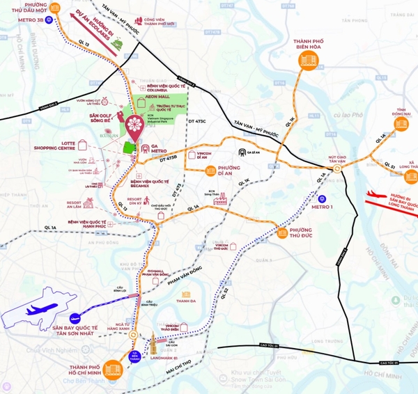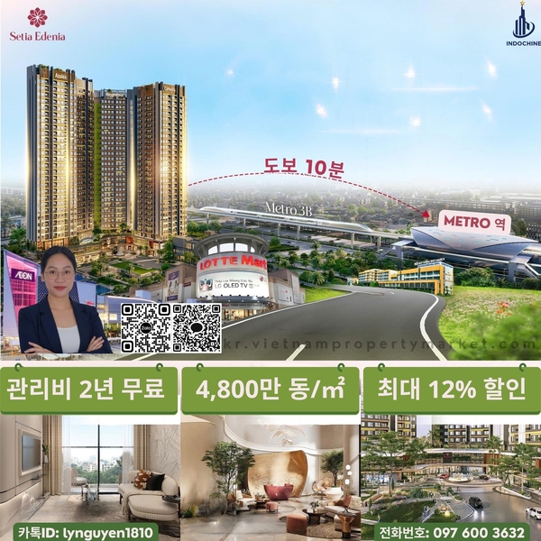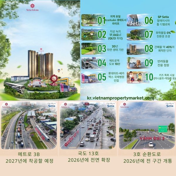 세티아 에데니아(Setia Edenia)는 에코쑤언(EcoXuân) 생태도시 내 고급 주거 프로젝트로, 국도 13번(QL13) 대로변에 위치하며 메트로 3B(미래) 노선 축을 따라 조성되는 교통 호재의 직접 수혜 지역이다.