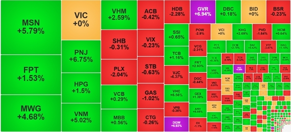 거래대금은 전일 대비 9조1천억동 이상 급감한 약 25조4천억동으로 유동성이 크게 위축됐다. 외국인 투자자는 순매도 4630억동을 기록했다. VIC(빈그룹)이 3640억동 이상 가장 많이 팔렸고, ACB(2150억동), MWG·GAS·VJC(각 약 1000억동) 순으로 순매도됐다. 반대로 MSN은 외국인 순매수 3500억동 이상으로 가장 많이 사들여졌으며, 장중 상한가 근접 후 5.8% 상승 마감했다. MSN 거래대금은 시장 1위인 2,000억동을 돌파했다. 외국인은 FPT와 PNJ도 적극 매수했다.