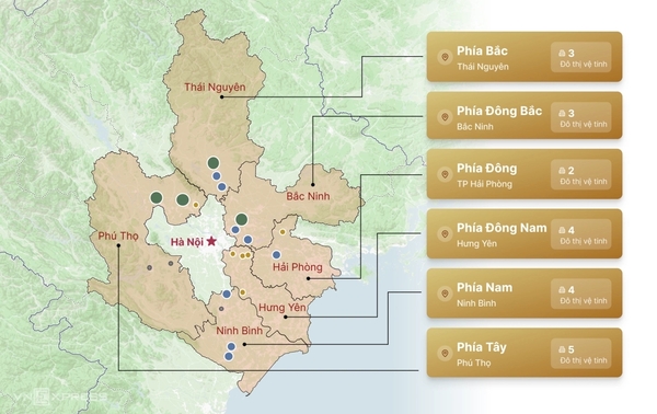 수도권 마스터플랜은 하노이를 중심으로 주변 지방 도시들을 위성 도시로 하는 방사형 도시 클러스터 구조를 제시한다.