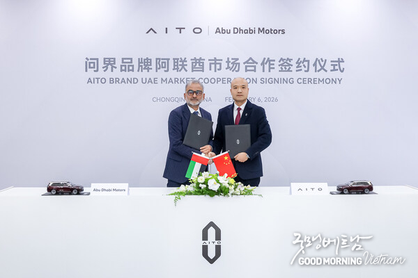 (굿모닝베트남미디어) 충칭, 중국 2026년 2월 8일 -- 중국의 지능형 럭셔리 차량 브랜드 아이토(AITO)가 아랍에미리트의 대표적인 럭셔리 자동차 딜러 그룹인 아부다비 모터스(Abu Dhabi Motors, ADM)의 자회사 퍼포먼스 플러스 모터스(Performance Plus Motors)와 전략적 협력 계약을 공식 체결했다. 이번 계약은 중국 충칭에서 진행됐으며, 세레스 오토(SERES AUTO)의 제이슨 왕(Jason Wang) 해외사업부 사장과 아부다비 모터스의 사이드 파이즈 카림(Syed Faiz Karim) 최고경영자(CEO)가 서명했다. 세레스 오토의 레온 허(Leon He) 사장과 ADM의 켈빈 자오(Kelvin Zhao) 중국 대표는 증인으로 참석했다. 이번 파트너십은 아이토의 해외 럭셔리 신에너지차(NEV) 시장 진출에 있어 중요한 이정표로, 글로벌 성장의 다음 단계를 공식적으로 알리는 계기가 됐다.
