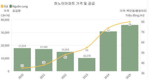 2014~2022년까지 전체 공급의 80~90%를 차지하던 중저가 상품은 2023년 이후 급감했고, 현재는 고급·럭셔리 주택이 80% 이상을 차지하고 있다. 일부 도심 프로젝트는 ㎡당 9,000만~1억1,000만 동, 초고급 단지는 ㎡당 1억2,000만 동을 넘어서고 있다.