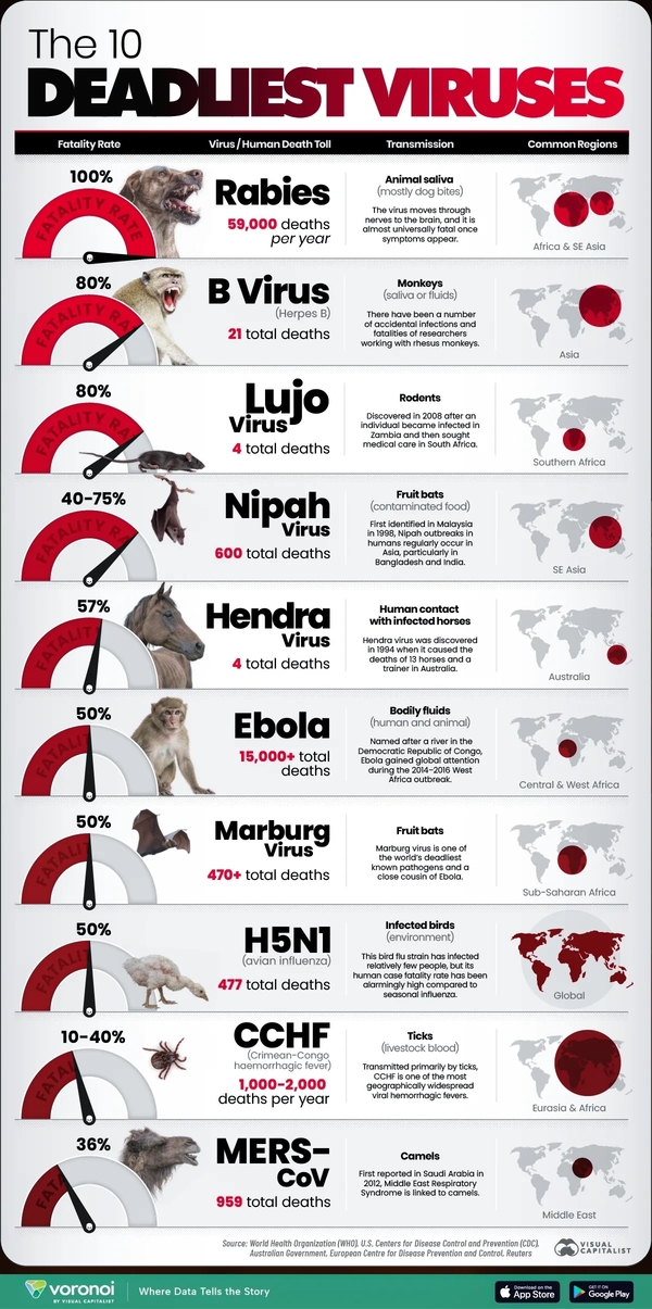 세계에서 가장 치명적인 바이러스의 대부분은 박쥐, 설치류, 낙타, 조류를 포함한 동물에서 유래한다.