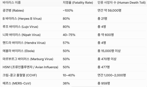 조류 인플루엔자(H5N1)는 감염된 조류로부터 전파되며, 확진된 인체 감염 사례에서 치사율이 약 50%에 달한다. 이는 계절성 독감보다 훨씬 높은 수치다. 인체 감염은 비교적 드물지만, 높은 치사율로 인해 전 세계 보건 당국은 경계를 늦추지 않고 있다.