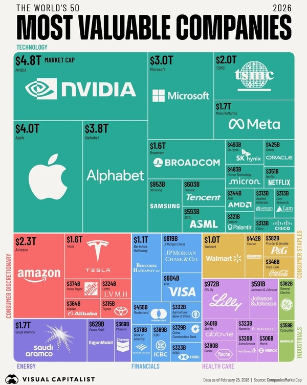 엔비디아는 시가총액 4조 8천억 달러로 2026년 세계에서 가장 가치 있는 기업이 될 것이다. 인공지능(AI) 거품에 대한 우려에도 불구하고 기록적인 매출 증가로 기업 가치가 상승하며 애플과 알파벳을 다시 한번 제쳤다. 한편, TSMC의 시가총액 2조 달러는 메타 플랫폼과 테슬라를 모두 넘어 세계 6위에 올랐다.