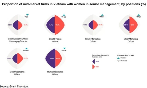 그랜트 손튼(Grant Thornton)의 '2025년 여성 기업인 전망' 보고서에 따르면, 2025년 베트남의 여성 고위 경영진 비율은 37.4%에 달할 것으로 전망된다. 이는 전년(33.4%) 대비 4%포인트 상승한 수치로, 세계 평균(34%)은 물론 미국(34%), 중국(35.3%)보다도 높다. 특히 여성 경영진 비율이 각각 21.7%와 18.4%에 머문 한국과 일본을 압도적인 차이로 앞선다.