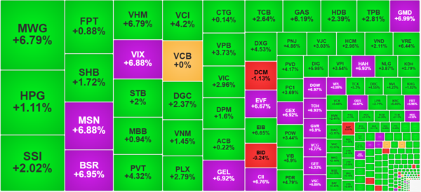 이날 호치민시 증시에서는 290개 이상의 종목이 상승하며 시장 분위기를 주도했고, 이 가운데 30개 종목이 상한가를 기록했다. VN30 지수 구성 종목 가운데서는 GVR, MSN, VPL이 상한가에 도달했으며, VIC는 3% 상승한 146,600동까지 오르며 시장 상승을 견인했다. VIC를 비롯해 대부분의 상승 종목은 대형주 중심이었다.