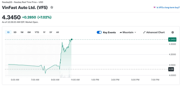 4월 10일(미국 현지 시간) 나스닥에서 빈패스트 주가는 전일 대비 7% 상승한 4.35달러를 기록했으며, 지난 한 달 사이에만 38% 급등했다. 시가총액은 100억 달러를 돌파했다.