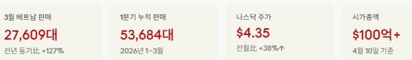 【굿모닝베트남 | 자동차】 베트남 전기차 기업 빈패스트(VinFast)가 2026년 3월 창사 이래 최고 판매 실적을 잇달아 경신하며 투자자들의 이목을 집중시키고 있다.