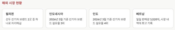 빈패스트는 베트남을 포함해 인도, 인도네시아, 필리핀 등 주요 해외 시장 전반에서 2026년 3월 사상 최고 실적을 달성했다고 밝혔다. 동남아시아와 남아시아 시장에서 브랜드 인지도와 판매망이 빠르게 확대되면서, 빈패스트의 글로벌 전기차 플레이어로서의 위상이 한층 높아지고 있다는 평가다.