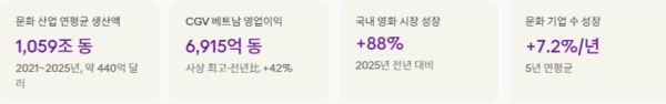 문화체육관광부에 따르면 2021~2025년 베트남 문화 산업 연평균 생산액은 1,059조 동(약 440억 달러)에 달하며, 사업체 수와 종사자 수 모두 연평균 7% 이상 성장했다. 특히 2025년은 국내 영화 시장이 전년 대비 88% 급성장하고, 콘서트·공연 시장도 전례 없는 활기를 띤 해로 기록됐다.