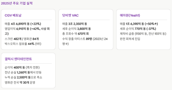 【굿모닝베트남 | 문화】 베트남 엔터테인먼트 산업이 2025년에 이어 2026년에도 강력한 성장세를 이어갈 것으로 전망된다. CJ CGV의 베트남 영업이익이 사상 최고치를 경신하고, 갤럭시 엔터테인먼트가 4년 만에 흑자 전환에 성공하는 등 주요 플레이어들이 일제히 호성적을 거뒀다.