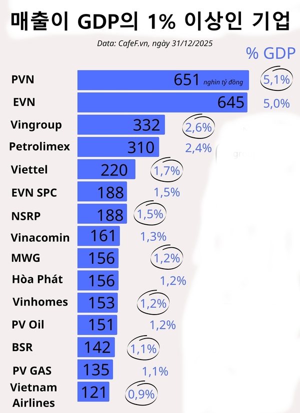 베트남에서 가장 높은 매출을 기록하는 기업은 PVN과 EVN이다. 2025년 정확한 수치는 아직 발표되지 않았지만, PVN은 2025년 연결 매출을 약 651조 동(GDP의 5.1%)로 예상하고 있다. EVN은 연결 매출을 약 645조 1,950억 동(GDP의 약 5%)로 추산하고 있다.