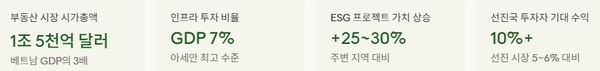 FIDT의 응오탄후안 CEO는 "외국 자본은 이제 자산이 아닌 개발 생태계를 추구한다"고 강조했다. 투자자들은 단순히 건물을 매입하는 것이 아니라 메가시티·스마트 산업단지·데이터센터 인프라 구축 프로젝트에 직접 참여하고 있다. ESG 기준을 충족하는 프로젝트는 주변 대비 25~30%의 가치 상승 잠재력을 갖는 것으로 분석된다.
