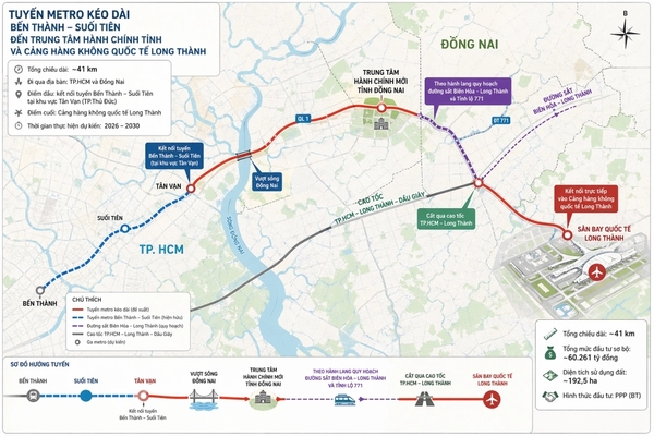 【굿모닝미디어 | 경제·교통인프라】 베트남 동남부 핵심 교통축으로 자리 잡은 벤탄-쑤오이띠엔 지하철이 롱탄 국제공항까지 연장되는 대형 인프라 사업이 추진된다. 동나이성은 기존 노선을 약 41km 연장해 공항과 직접 연결하는 계획을 제안했으며, 총 투자액은 60조 2,610억 동에 달한다.